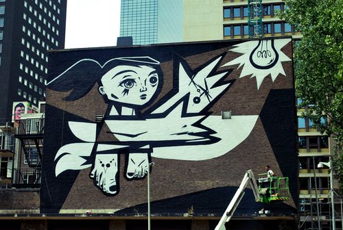 Op blinde muren, vaak de kopse kant van een kantoor of galerijflat, toveren de schilders grote vrouwfiguren tevoorschijn en fantasiedieren vol snavels en poten. Soms in zwart-wit, dan weer in knalpaars en -groen, vaak ook in gouden en bronstinten. Het is gevarieerder dan de vaak zo herkenbare Nederlandse graffiti die artistiek gezien gestagneerd is - dezelfde felle kleuren, ronde stileringen, letters en zwarte contouren als in de jaren tachtig.