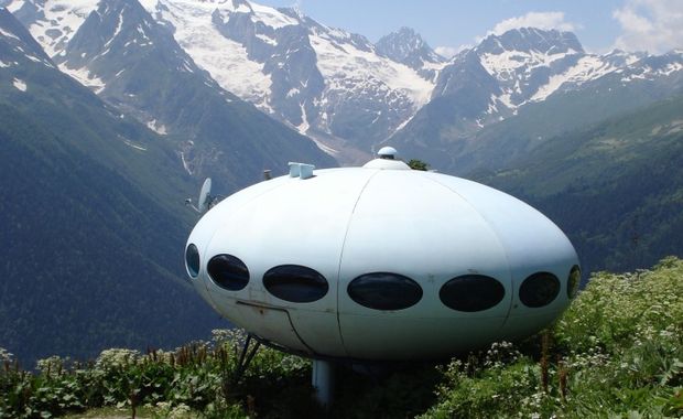 Praktisch was het niet - een gezinshuisje met tapijt waar je nooit een groentehapje uitgekrabd krijgt. Maar o wat was hij cool. Vijftig landen kochten licenties. Andy Warhol wilde ermee op de foto, de koninklijke familie van Kuweit ook. Christo pakte hem in. Promotiedames in babydolls liepen er rond. De glossies, ook een nieuw naoorlogs fenomeen, maakten mooie reportages met grapjes 'Where are the little green men?' en Playboy schoot er een sexy fotoserie. De plannen werden fantastischer: skivalleien vol ufo's, flatgebouwen waar je ze in kon klikken, als een intergalactische parkeerplaats. Het huisje kon overal gemonteerd worden waar de vakantiebrochure het moderne gezin maar heen zou leiden.