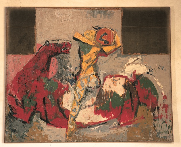 Maar bij zijn tweede grote thema, ruiter te paard, weet ook Marini eindelijk te vlammen. In 1956 schildert hij het monumentale Orpheus. Daar wordt het paard een strijdros, rood en angstig, met op zijn rug een getormenteerde Orpheus overschaduwd door vlakken. In die jaren begon hij paarden te schilderen die hun ruiters afwerpen, naar Picasso, wel zo'n woest wonderkind. De ruiters van laatbloeier Marini zijn beelden van scheuring, strijd, tragiek. Zijn voorheen soms kokette lijnen worden hier krachtig en grimmig, tot de dampende flanken oplossen in abstractie. Het lijkt wel of die doeken doen denken aan het existentialisme van die tijd: de mens op zoek naar zingeving, omringd door een goddeloze wereld - bij Marini een schilderachtige leegte. Die existentiële eenzaamheid maakt de klassieke thema's weer modern en maakt Marini interessant.