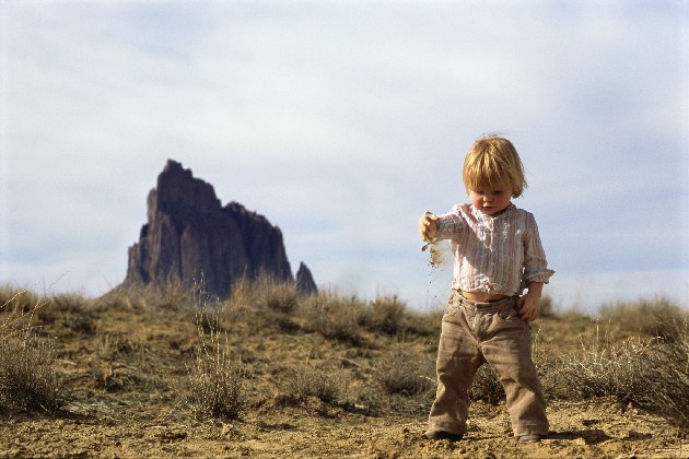 berglandschap aarde over de onvruchtbare grond strooit. Het peutertje