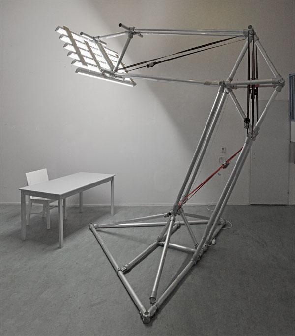 Vrijdag opende Roelens editie. Hij maakte met de buizen een bekend soort bureaulamp - Ikea, Hema - van drie meter hoog. Daarmee wilde hij laten zien hoe mooi en eerlijk dit soort constructies zijn die in elk huishouden onopvallend in een hoekje staan. Roelens object daarentegen helt gevaarlijk over een bureau dat geïntimideerd lijkt te zijn door dit agressieve gevaarte van moderne principes.
