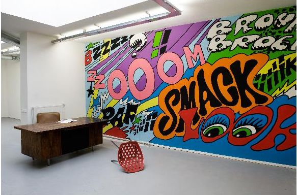 Ook kunstenaars hebben niets meer te bevechten: alles is al bereikt. Natuurlijk, de kunsthatende PVV rukt op maar hongerbuikjes zie je nog nergens. Dus geen wonder dat nu een kunstenaar een kunstwerk over Guust Flater heeft gemaakt. Rufus Ketting bouwde in Galerie Frank Taal Flaters kantoor na waar de boze klant voor de zoveelste keer is weggestormd. De omgegooide stoel ligt voor het oerdegelijke bureau en op de wand schilderde Ketting de kreten na van de bijbehorende woede-uitbarsting uit het stripverhaal.