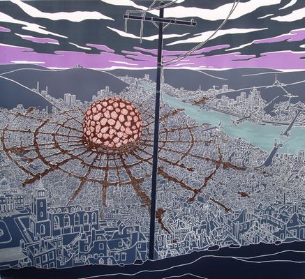 Onheilsprofeet Voerman heeft geen Nieuw Testament nodig om aan te tonen waar het mis gaat met onze wereld. De scheuren in onze beschaving kondigen zich aan in onze überordentelijke stedenbouw waarin ons overgeorganiseerde leven zich afspeelt. Het omslagpunt blijkt vooral in zijn tekeningen. Daar zijn steden nog deels intact maar doemen aan de einder sloppenwijken op of torenhoge explosies. Soms zit een gezin voor het raam naar buiten te kijken - niet zozeer verlamd van angst als wel apathisch door dagelijkse sleur.