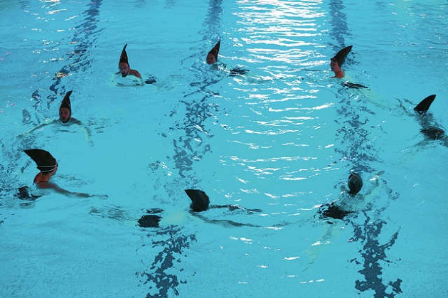 Synchroonzwemmen met haaienvinnen