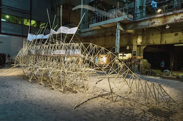 "Hij is moe," legt Jansen uit aan het toegestroomde publiek. "Dit zachte zand is moeilijker om op te lopen dan het harde strand." De Suspendisse sist bevestigend, dan mag hij uitrusten. Zijn dagelijkse oefening in de Haagse Electriciteitsfabriek is afgelopen. De Suspendisse is de zevenendertigste telg in de strandbeestenfamilie van Theo Jansen: mobiele sculpturen van pvc-buizen. Hij test ze uit op het op het strand bij Scheveningen maar ook reizen ze de wereld rond van de VS tot Japan, waar Jansen enorme schares fans heeft onder kunstmensen zowel als techneuten.