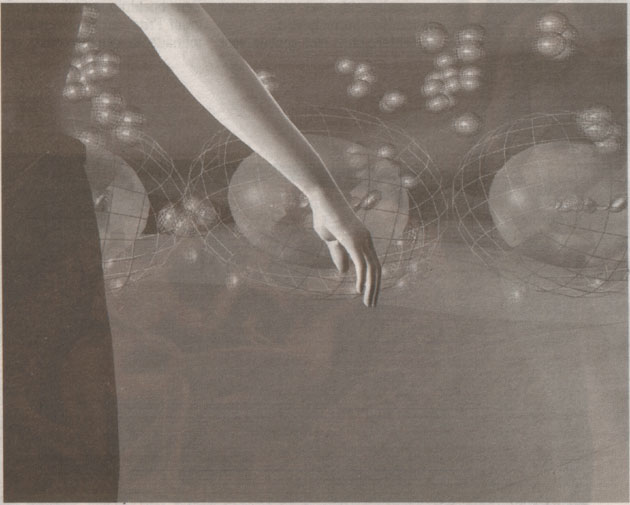 glimmende abstracte wereld. Ze wordt er omgeven door membranen en