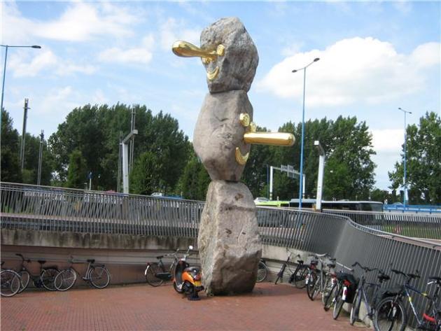 Eind vorig jaar werden 'De Aardappelmannetjes' onthuld. Drie enorme zwerfkeien had de kunstenaar uit Denemarken gehaald, opgestapeld, en twee daarvan voorzien van een gestileerde neus, mond en ogen van bladgoud. Iedereen kent uit zijn jeugd nog wel de felgekleurde prikkers die je in een aardappel steekt zodat het een mannetje lijkt. Lollige figuurtjes die metershoog ineens wat eng worden, met die opengesperde ogen en brede grijns die je hysterisch aanstaren. Ruwe steen, glanzend goud - dit acht meter hoge beeld valt op, precies zoals bedoeld was. Voor de snelle kijker staat er een glanzend sieraad voor het plein. Voor de goede kijker staat er een beeld dat blijft boeien want, hoe langer je kijkt, hoe monsterlijker het wordt.