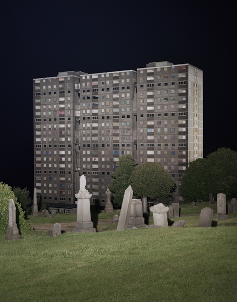 Bij Stroom steken Gaillards cut-n-paste prentjes lommerrijk af naast een muur met polaroids van verpauperde buitenplekken. Hiervoor kiekte hij beton met graffiti, afbrokkelende toeristenoorden, met terugkerende afrasteringen van metaaldraad - de design van de angst, die oprukt in de buitenruimte. Tussen de kleine werkjes hangt een enorme nachtfoto van een leegstaande flat met grafzerken tegenover. Deze moet gephotoshopt zijn, denk je, zo'n horrorplek kan niet echt zijn. Toch bestaat het, in Glasgow. Gaillard heeft alleen het licht gemanipuleerd. Overdag zou dit een Vogelaarwijk met stip zijn. Maar 's nachts, met een dramatische belichting, wordt het de liefdesbaby van Le Corbusier en Ledoux.