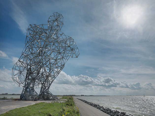 Zo kreeg het platteland van de Flevopolder vijf spectaculaire land art werken, die een attractie zijn geworden. Aan dat rijtje is gisteren een zesde werk toegevoegd: Exposure , gemaakt door de Brit Antony Gormley. Dit beeld, een doorzichtig staalskelet in de vorm van een hurkende man, staat op een strekdam in de haven van Lelystad. Zesentwintig meter hoog verrijst het er majestueus boven de vlakke horizon waar de man op uit lijkt te kijken. Door het skelet heen zie je de lucht en het IJsselmeer, dat reflecteert op het glanzende staal.