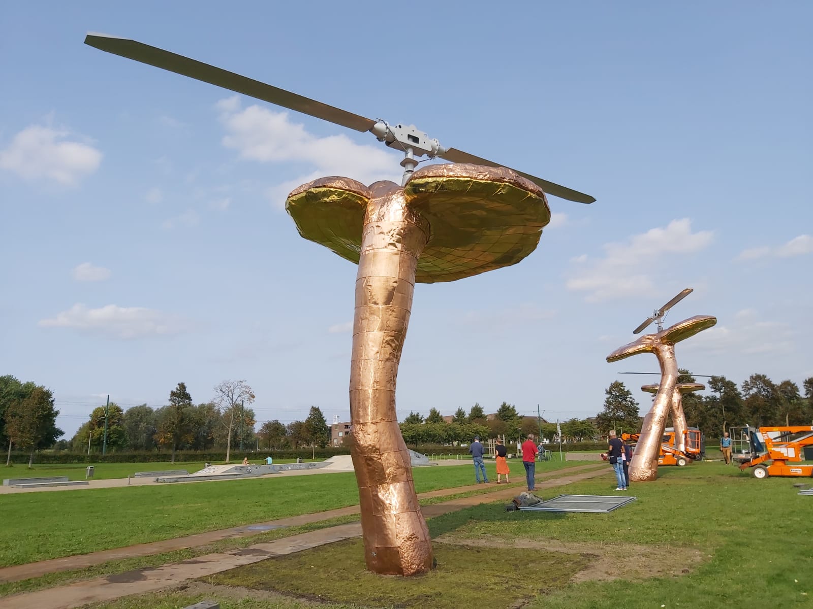 Dat kon doordat Huang vorig jaar in Abcoude de resterende technieken, details en materialen had goedgekeurd. Er lagen messing platen voor de onderkanten van de hoeden, koper voor de rest van de paddenstoelen. Anything is Possible had conform zijn naam een procédé ontwikkeld om de platen op een kunststof ondergrond te lijmen en slaan. Het messing en rode koper zullen langzamerhand bruin worden, legde Huang uit, de kleur van echte ling zhi. Of iets groener daar waar de honden hun behoefte doen, dat vond hij ook oké. „Over twintig jaar is het een ander beeld. Groeien zullen ze niet meer doen, verkleuren wel. Het bruin contrasteert met die staalkleurige helikopterbladen, die gaan bewegen. Een soort Nederlandse windmolens”, glimlachte Huang.