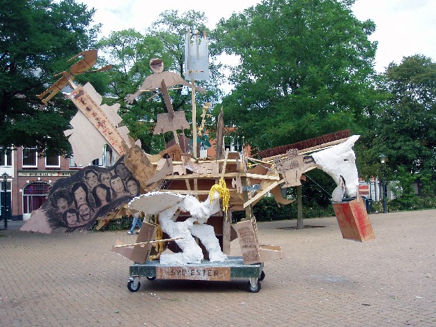 het kunstwerk: een wiebelige warboel van gefiguurzaagde triplex