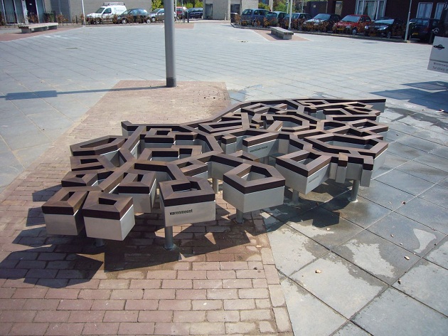 Vaak is straatmeubilair gestandaardiseerd en opgedeeld met leuningen om te voorkomen dat daklozen er gaan slapen. In de Hilversumse Meent zijn geen daklozen. De aspirant-gebruikers zijn enkel omwonenden, die na de onthullingspraatjes vorige week de bank uittestten. Ze zijn tevreden: geen kinderbeentjes raken bekneld in de bochtige hoekjes. Dit werk zal langer meegaan dan het vorige, een glazen abstractie die jaren geleden ten prooi viel aan vandalen.
