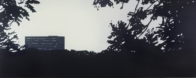 Maar kunst is geen interieurverf. Door die rare matte verf in ondefinieerbare tinten lijkt het toch alsof ook Claessens met zijn karige doeken iets verbergt. Zo verbeeldt hij een flat achter donker struikgewas als een schuldig landschap: netjes en kaal, alsof geboefte snel uit beeld dook. Ook een rustige man als Claessen weet dat een net zo rustig uitziende wereld onecht overkomt. Dat geeft zijn ordentelijke werk dan toch de onbetrouwbaarheid die nodig is om spannend te zijn.