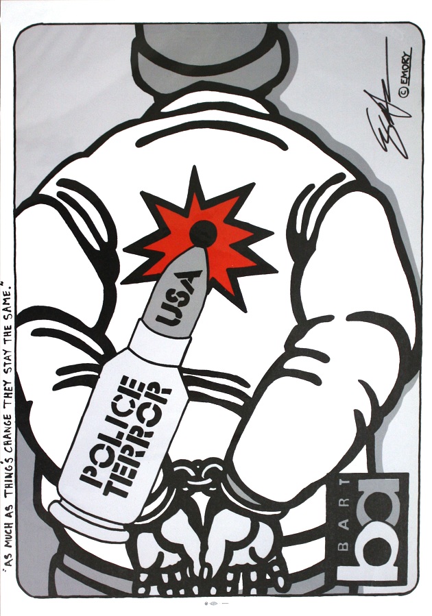 Begin jaren zeventig kreeg vormgever Emory Douglas (1943) een verontrustend telefoontje. "Wij handelen in kunst, bewonderen je werk, kunnen we afspreken?" Foute boel, wist Douglas meteen. Toen hij op het kantoor van de Black Panther Party een tweede telefoontje kreeg, hadden zijn collega-Panters hetzelfde vermoeden: FBI. "Die hielden me in de gaten," vertelt hij in Amsterdam bij vormgevingsinstituut Premsela, waar hij deze week te gast is. "Ik hing snel op. Als ze je in een val lokten, drugs erbij, werd je gearresteerd. Dat zagen we bij zwarte politici die ook vochten voor burgerrechten. De FBI heeft niet alleen 22 miljoen dollar gespendeerd om ons tegen te werken, ze organiseerden shoot-outs en liquidaties."
